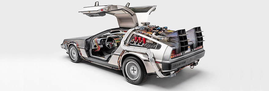 In the Back to the Future franchise, the DeLorean time machine is a time travel vehicle constructed from a retrofitted DMC DeLorean. Its time travel ability is derived from the "flux capacitor", a component that allows the car to travel to the past or future (though not through space). This occurs when the car accelerates to 88 miles per hour and requires 1.21 gigawatts of electricity. |